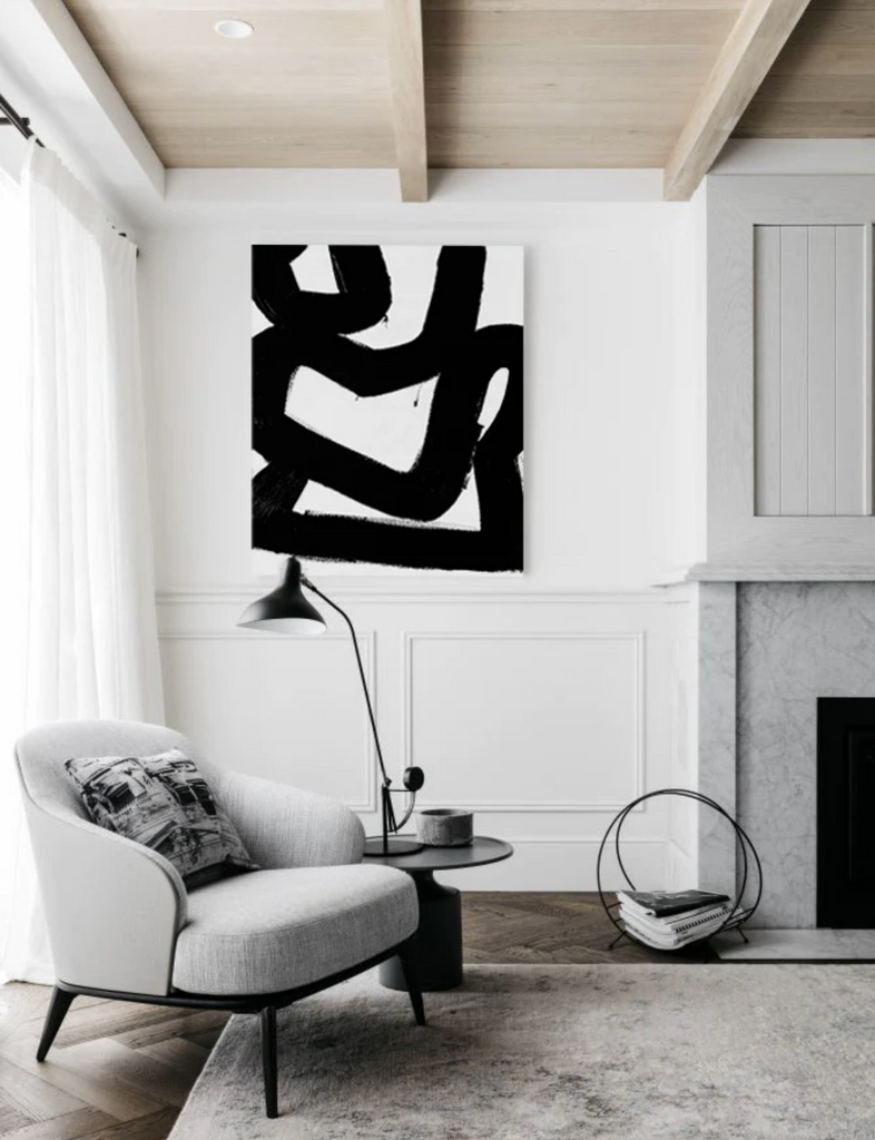 Here, my painting ‘Read’ sits in harmony with the modern, minimalist décor and architectural details. The strength of the thick, black, expressionist brushstroke softened through the small drips of paint splashed upon primed canvas. It is in those tender details where the energy of the artwork is held and offered back to the room.