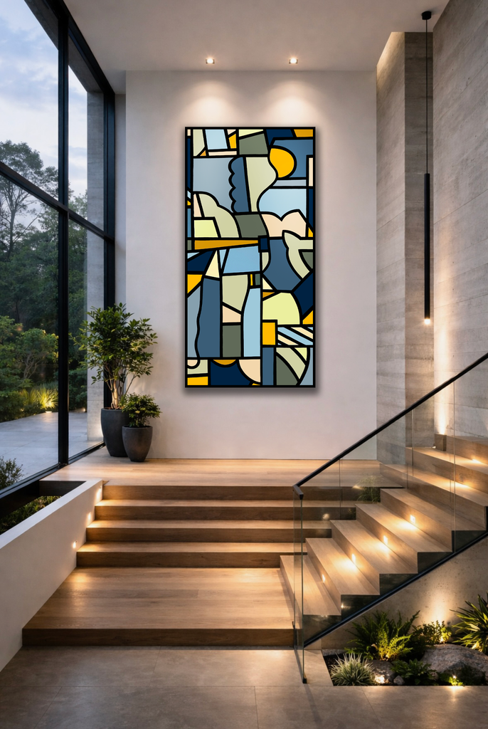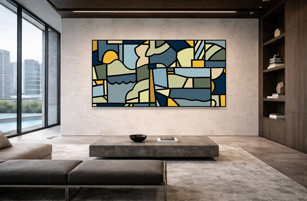 Anchored between stillness and motion, this work explores the quiet geometry of stability — the meeting point between grounded form and open horizon. Planes of colour hold tension and release, suggesting both containment and flow; a meditation on strength that doesn’t need to shout.