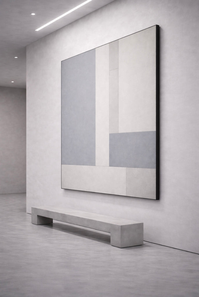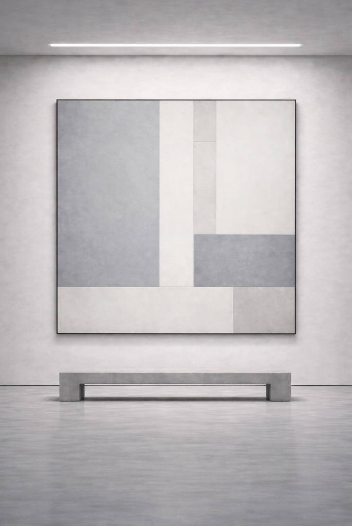 Built through layered acrylic and matte mineral tonality, the surface carries subtle atmospheric depth while preserving precise architectural edge.