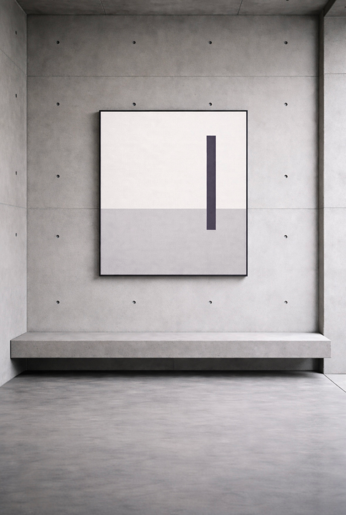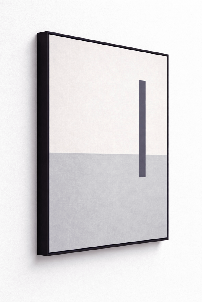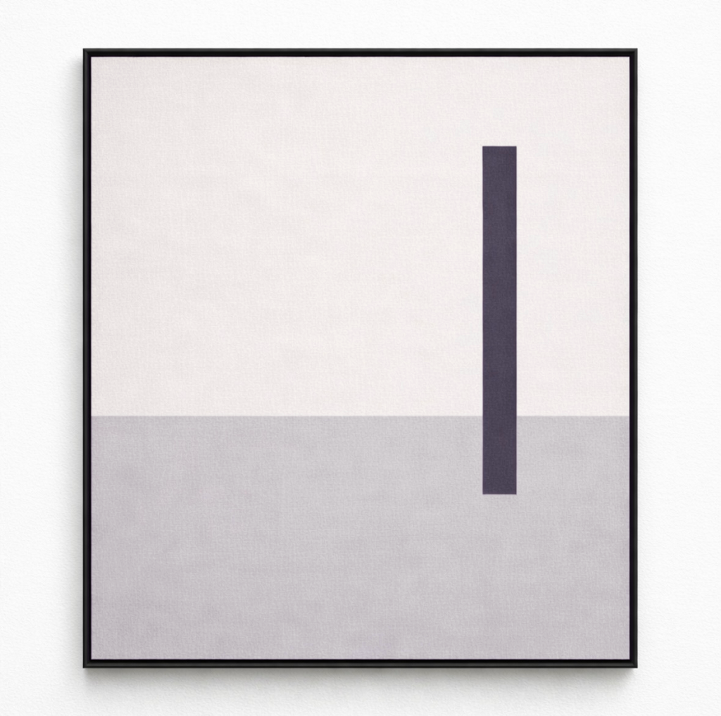 A horizontal datum stabilises the field. A single vertical element introduces controlled tension. The composition is resolved through proportion rather than gesture.