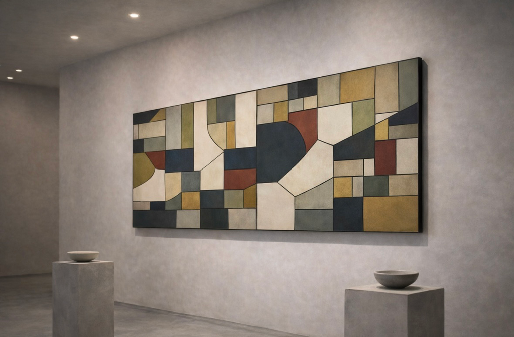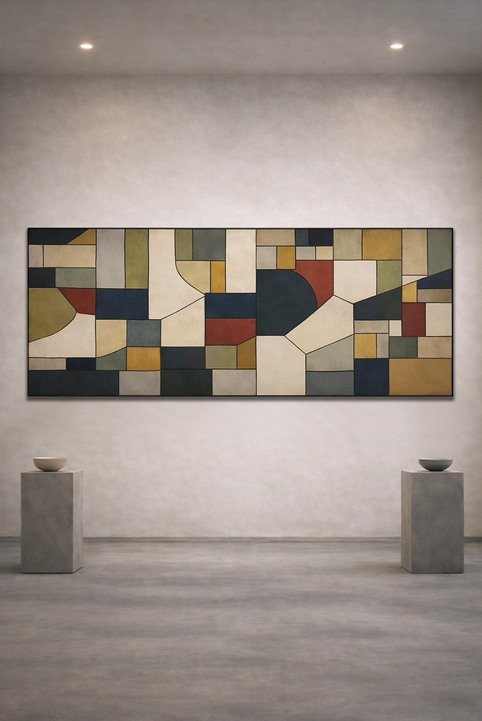 FIELD extends Composed Abstraction™ into architectural proportion, unfolding across a horizontal field where colour operates as structure rather than surface. Layered planes hold a measured tension between stillness and movement, inviting the viewer to experience painting as spatial presence rather than image. At monumental scale, the work engages the rhythms of built space—anchoring perception, slowing time, and establishing a quiet continuity between interior architecture and abstract form.