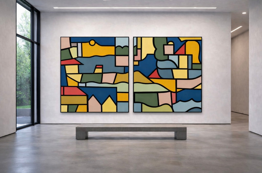 Continuum Diptych explores landscape, memory, and architectural rhythm through a continuous field of colour and line.