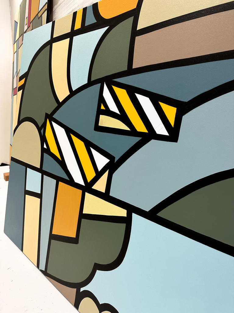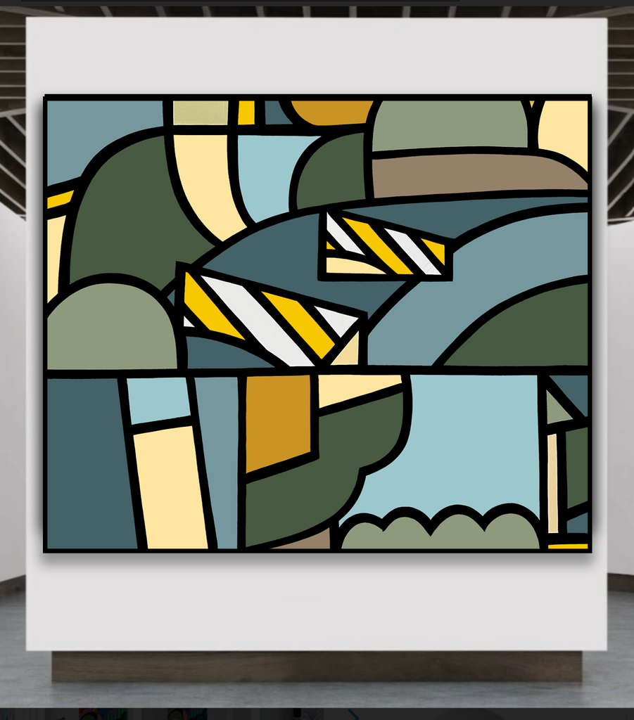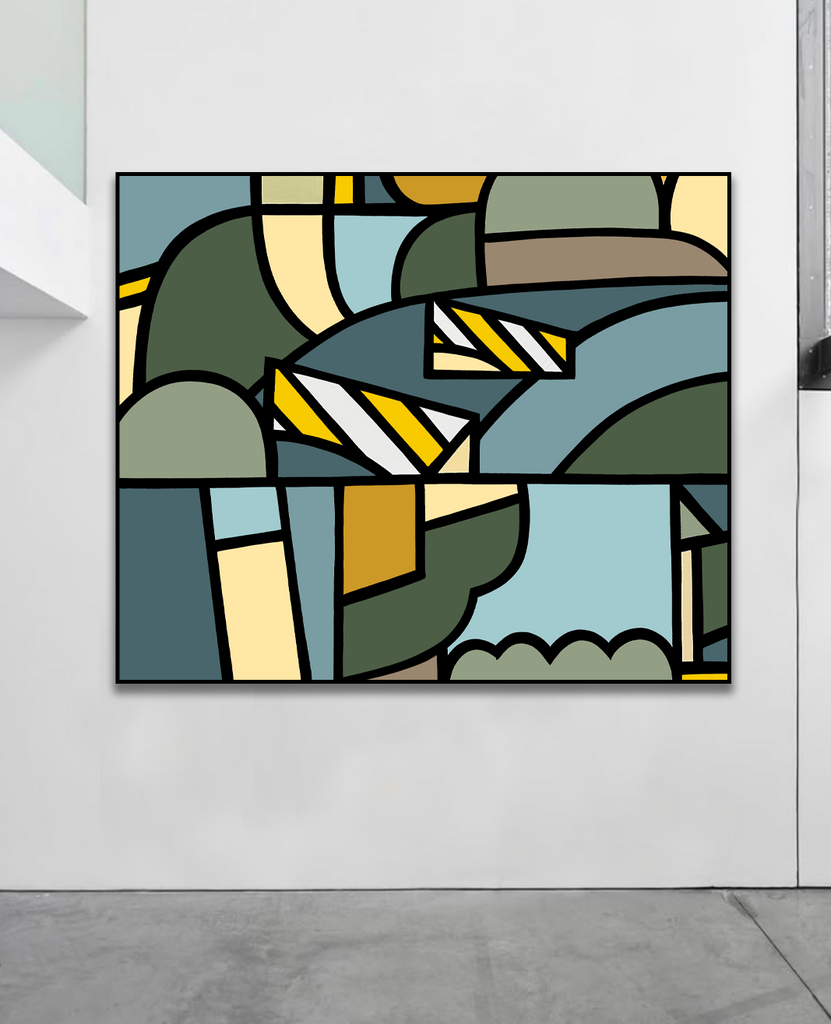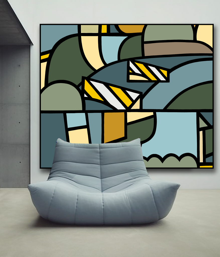 ‘Aether’ explores the luminosity of space and form — the light between structure and stillness. Geometric contours unfold like fragments of sky and land, intersecting in quiet rhythm. The palette, anchored in muted blue, olive, and ochre, evokes the atmospheric calm of coastal air. In balance and restraint, ‘Aether’ reveals the architecture of serenity.