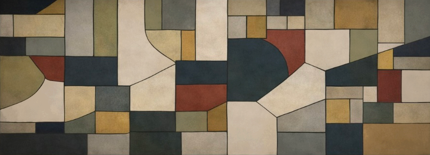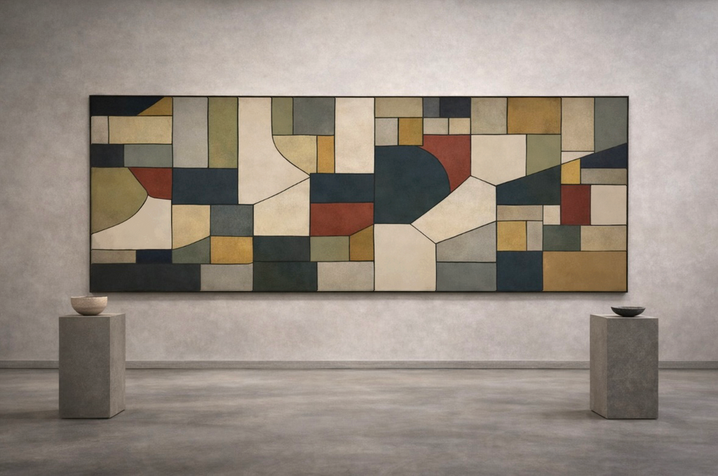 FIELD extends Composed Abstraction™ into architectural proportion, unfolding across a horizontal field where colour operates as structure rather than surface. Layered planes hold a measured tension between stillness and movement, inviting the viewer to experience painting as spatial presence rather than image. At monumental scale, the work engages the rhythms of built space—anchoring perception, slowing time, and establishing a quiet continuity between interior architecture and abstract form.