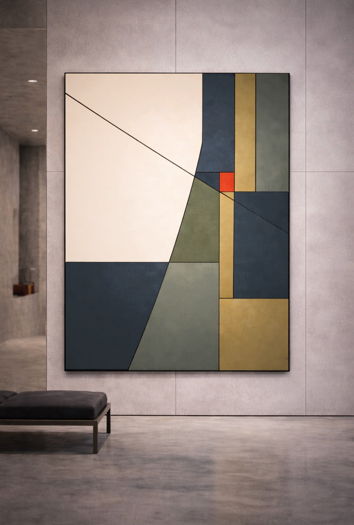 A diagonal trajectory reorganises space, creating quiet tension between balance and movement.