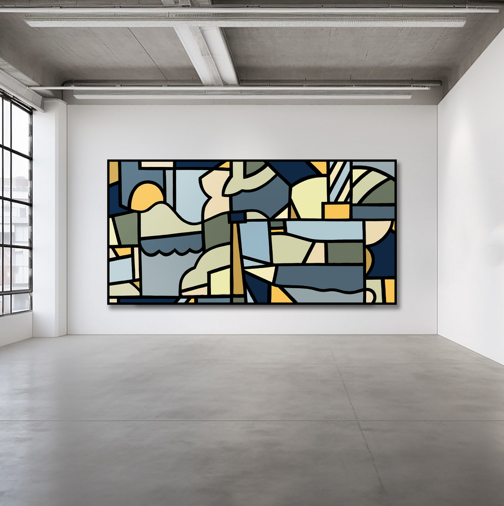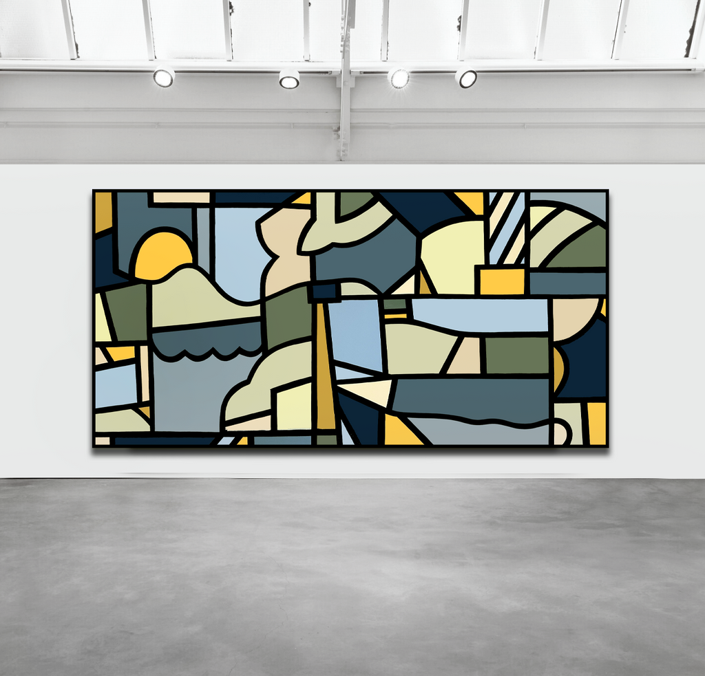 Anchored between stillness and motion, this work explores the quiet geometry of stability — the meeting point between grounded form and open horizon. Planes of colour hold tension and release, suggesting both containment and flow; a meditation on strength that doesn’t need to shout.