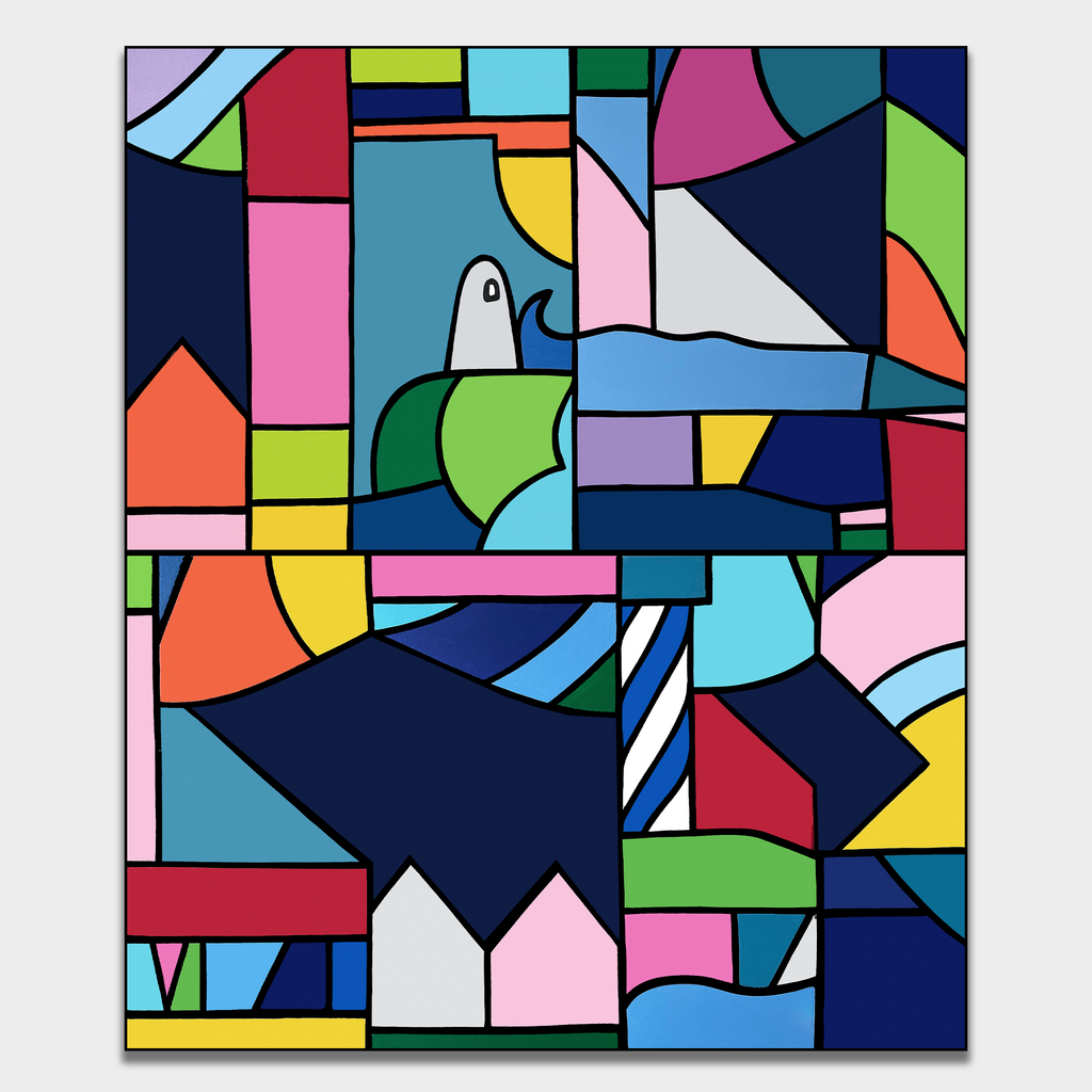 "LIGHTHOUSE" captures the essence of coastal life with the beacon standing as a symbol of hope and guidance amidst the energetic interplay of fragmented landscapes and vibrant colours. I am interested in navigating that sense of harmony between structure and spontaneity." -Joanna Wolthuizen, 2025